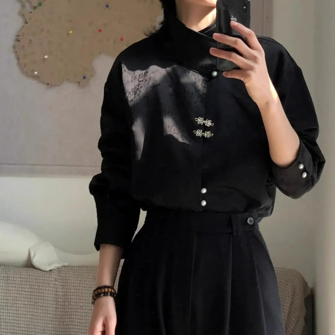 Estilo nacional satén irregular patrón oscuro cuello alto moda retro placa de metal botón camisa de manga larga para hombres mujeres - TopDealBox