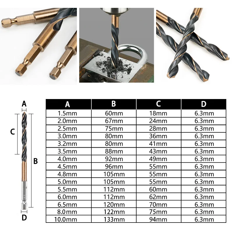 ♡Quick viewJuego de brocas helicoidales de vástago hexagonal, cortador de agujeros de Metal y madera, herramienta de perforación de núcleo, brocas de cobalto 1,5 2 2,5 3 3,5 4 5 6mm HSS, 3/7/13 Uds.11093.00 ARSHot★★★★★★4.8
