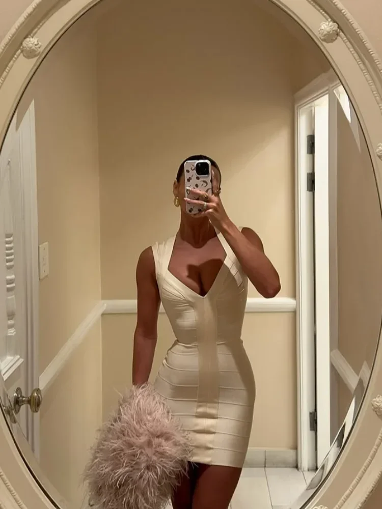 Vestido de punto con parche y cuello en V para mujer, Vestidos lisos sexys ajustados sin mangas con cintura elegante, Vestidos de fiesta para cena 2026 - TopDealBox